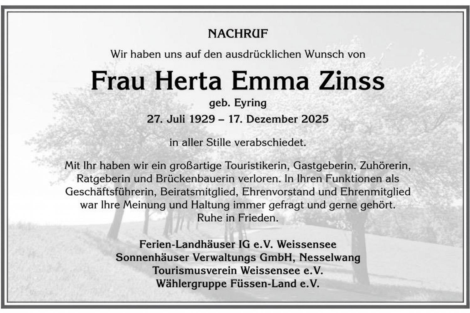 Am 17. Dezember 2025 ist unser Ehrenmitglied, Frau Herta Emma Zinss, für immer von uns gegangen.